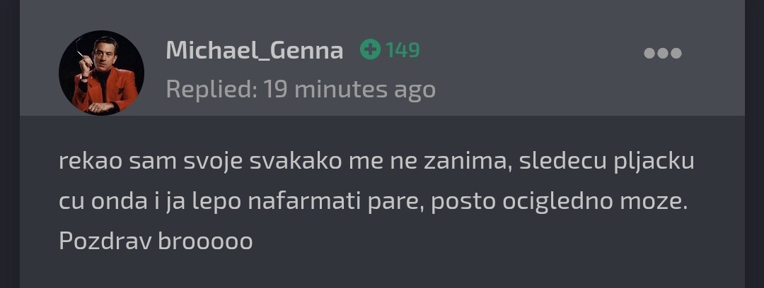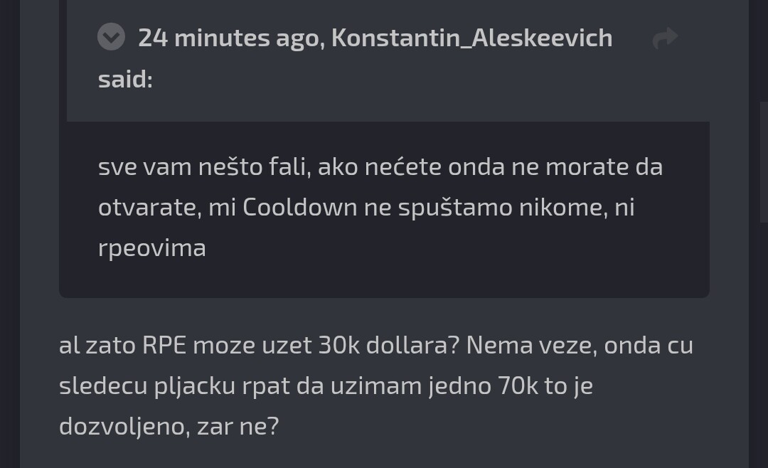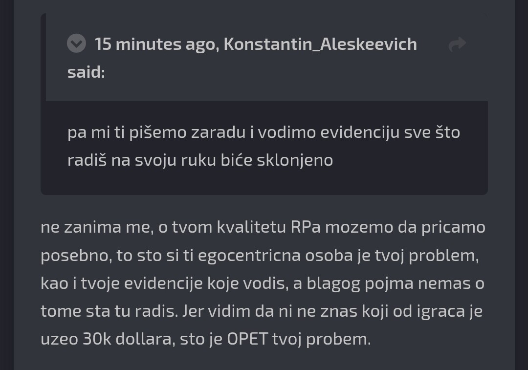 2. @Rista Ja "njega kamenom" on mene "hlebom" (ti si egocentričan, itd.). Smešno je što osoba pokušava sama sebi da određuje šta će da radi. Moj kolega je dobio taj iznos za koji nit sam pitan, nit me je kolega pitao šta kako gde, što ja ne mogu da utičem na to. Plus je dobio 10 dana Cooldown, a ti bi dobio 7 dana, sad ne znam kako stojiš sa brojkama, ali 7 i 10 nije isto koliko ja poznajem matematiku i brojke. Rekao sam ti da imam obaveze jedva uđem na forum da ispratim situaciju o čemu se radi, da bi ti drsko odgovorio "ne zanima me" "boli me kurac" itd. I onda ja vređam i tako dalje, prvi si počeo da skrećeš s teme govoriš o mojim zaduženjima, o poziciji, o znanju, gde ja ni jednog trenutka nisam spomenuo to. Lepo sam ti rekao da ne spuštamo i tako je za sve. Više se ne javljam, imam pametnije stvari da radim nego da se raspravljam sa nezrelom osobom. @Rista daj svoj komentar i presudi mi