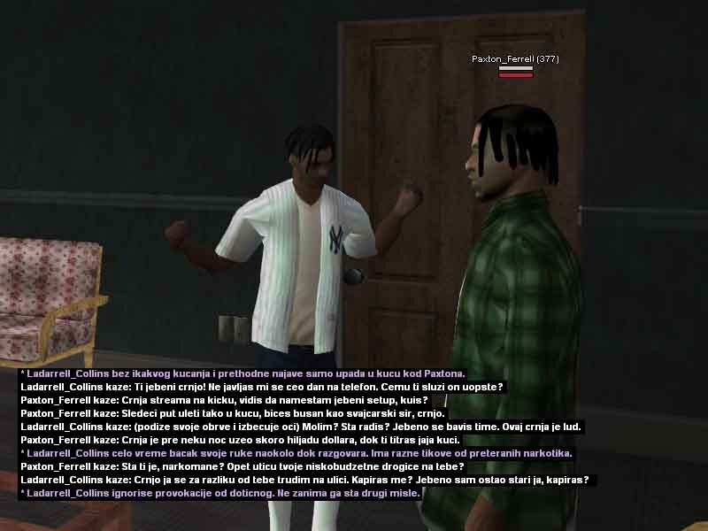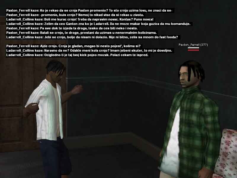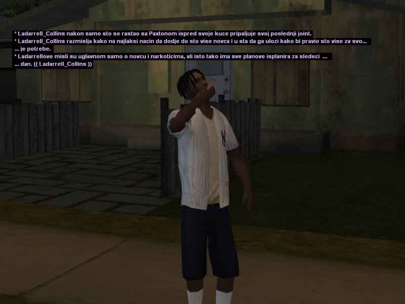 1. Ladarrell Collins 20y/o jedan od mladih crnja koji se može sresti na ulicama Los Santosa, bolje rečeno u samom Gantonu i okolini. Kao jako mlad je preuzeo svu životnu odgovodnost na sebe, svidelo se to njemu ili ne morao je i mora sam da se bori za sebe kako bi preživeo i opstao na ulicama. Škola ga nikad nije zanimala pa je tako i izbačen iz nje jer je pretukao svog vršnjaka zbog druge boje kože i opredeljenosti. Vrlo problematičan i hladnokrvan za svoje godine, često je pod dejstvom lakih a i težih droga, uglavnom su to marihuana ili poznati MDM-a, zbog svojih slabijih finansija ne uzima toliko kvalitetne narkotike zato ima česte loše halucinacije, priviđanja i slično. Svoje dane i slobodno vreme provodi uglavnom na ulicama, tražeći svaki način da napravi što više novca kako bi ga trošio na narkotike i razne gluposti. Nije ni svestan šta mu se sve može desiti, samo zato što je /klinac/ koji ne zna šta zapravo znači ulica, suprotstavlja se bilo kome i bilo čemu iako ga to može vrlo skupo koštati. Probao je na svakakve razne načine da se kloni ulice i svog društva, ali mu ne polazi za rukom. Zato se i pomirio sa istinom da će večno provoditi život na ulici sa raznim propalicama i problematičnim crnjama poput njega, sve dok ne bude uhapšen ili čak šta više ubijen? Sve to zavisi od njegovih životnih odluka i životnih navika koje ga sputavaju iz dana u dan za bolje sutra.