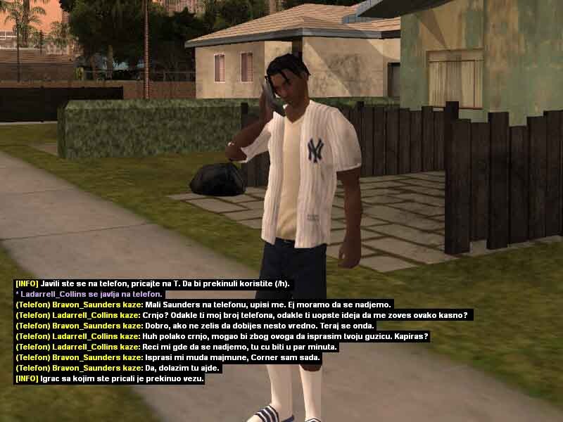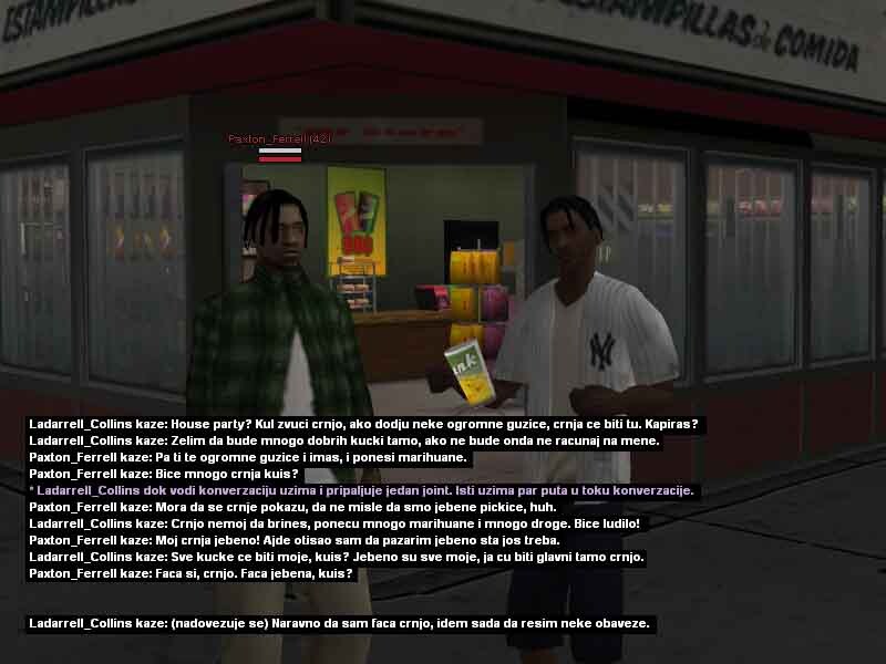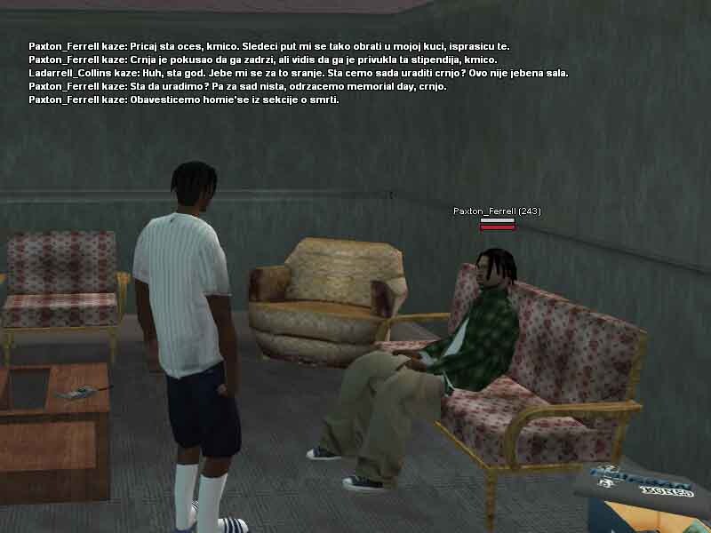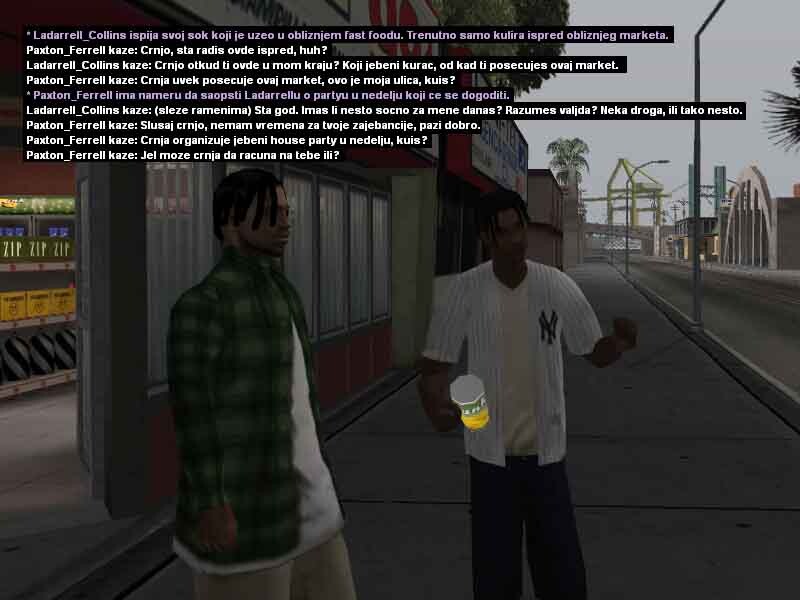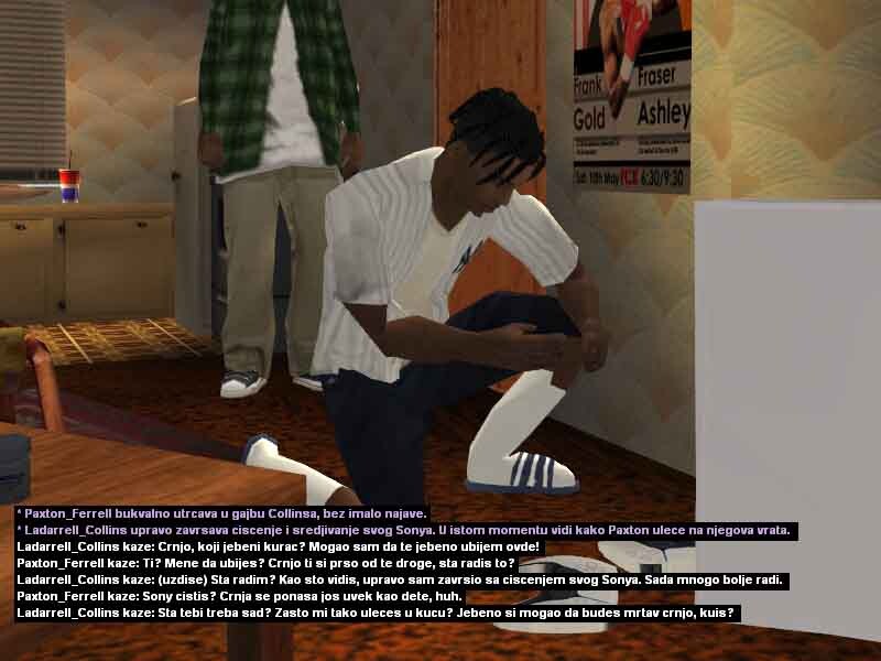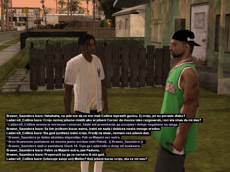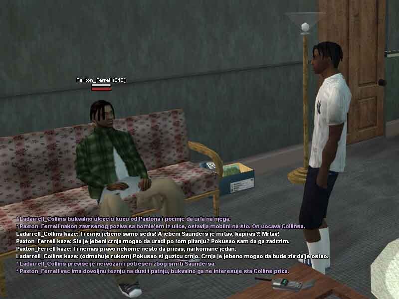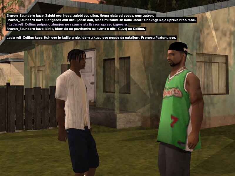 2. Ladarrell Collins 20y/o jedan od mladih crnja koji se može sresti na ulicama Los Santosa, bolje rečeno u samom Gantonu i okolini. Kao jako mlad je preuzeo svu životnu odgovodnost na sebe, svidelo se to njemu ili ne morao je i mora sam da se bori za sebe kako bi preživeo i opstao na ulicama. Škola ga nikad nije zanimala pa je tako i izbačen iz nje jer je pretukao svog vršnjaka zbog druge boje kože i opredeljenosti. Vrlo problematičan i hladnokrvan za svoje godine, često je pod dejstvom lakih a i težih droga, uglavnom su to marihuana ili poznati MDM-a, zbog svojih slabijih finansija ne uzima toliko kvalitetne narkotike zato ima česte loše halucinacije, priviđanja i slično. Svoje dane i slobodno vreme provodi uglavnom na ulicama, tražeći svaki način da napravi što više novca kako bi ga trošio na narkotike i razne gluposti. Nije ni svestan šta mu se sve može desiti, samo zato što je /klinac/ koji ne zna šta zapravo znači ulica, suprotstavlja se bilo kome i bilo čemu iako ga to može vrlo skupo koštati. Probao je na svakakve razne načine da se kloni ulice i svog društva, ali mu ne polazi za rukom. Zato se i pomirio sa istinom da će večno provoditi život na ulici sa raznim propalicama i problematičnim crnjama poput njega, sve dok ne bude uhapšen ili čak šta više ubijen? Sve to zavisi od njegovih životnih odluka i životnih navika koje ga sputavaju iz dana u dan za bolje sutra.