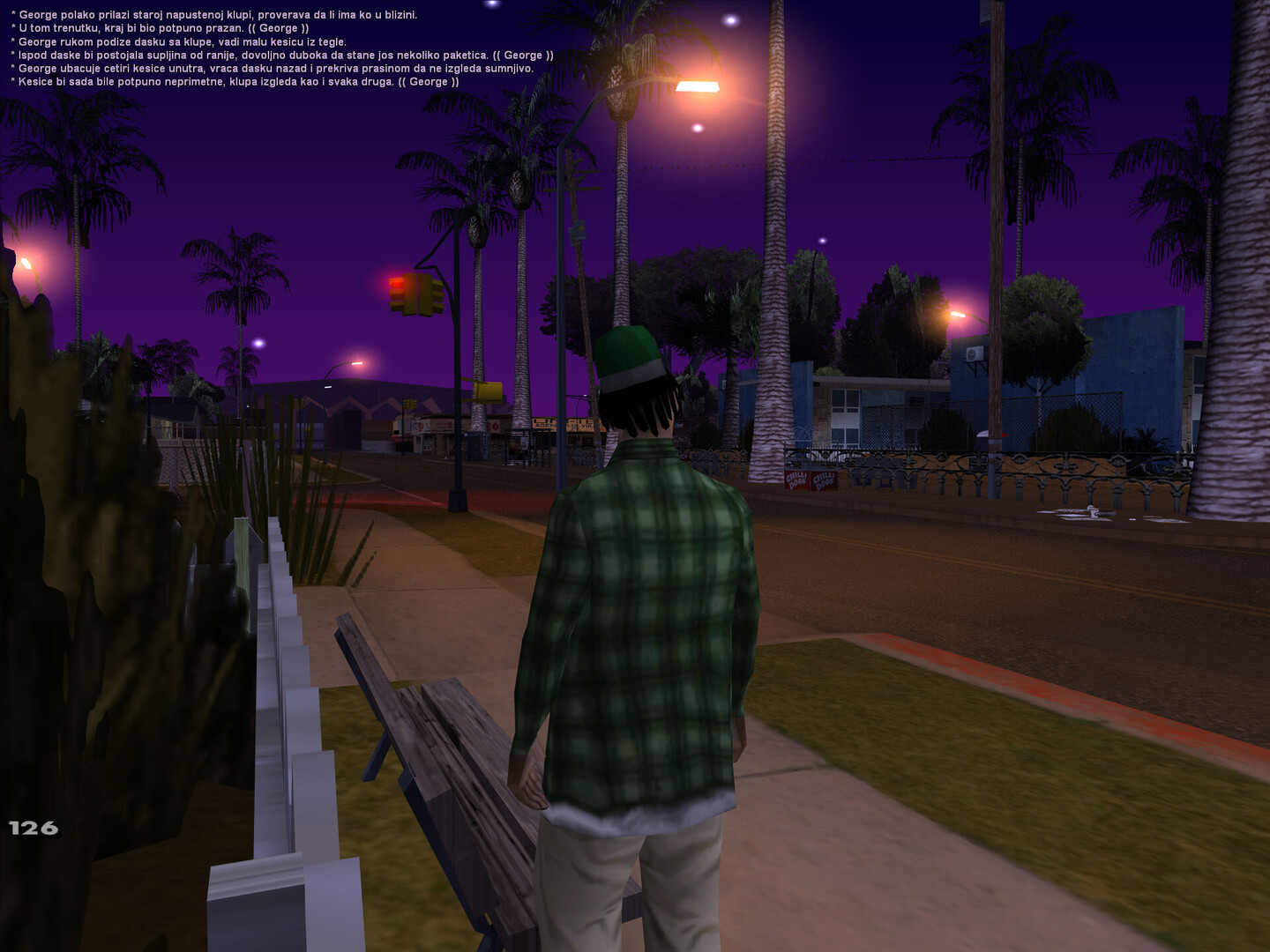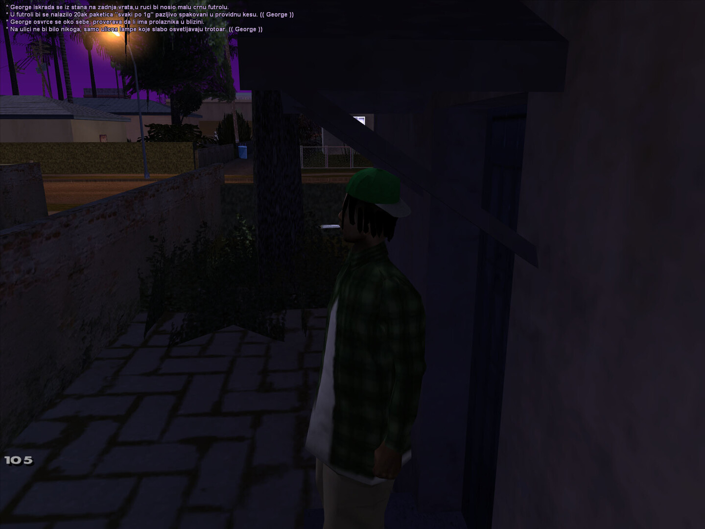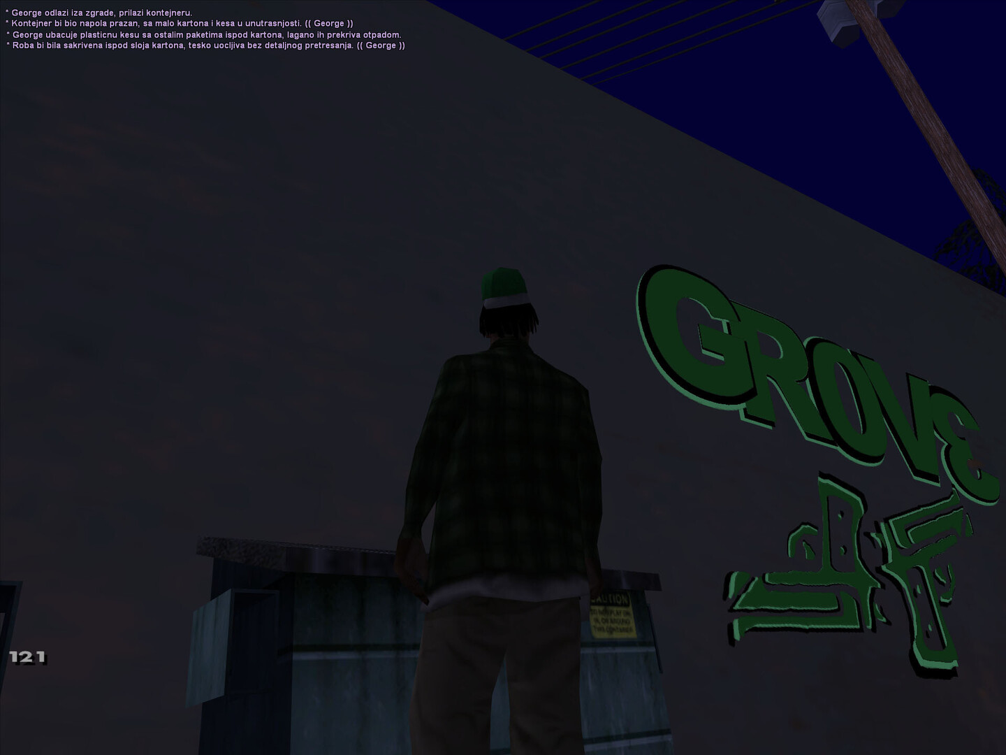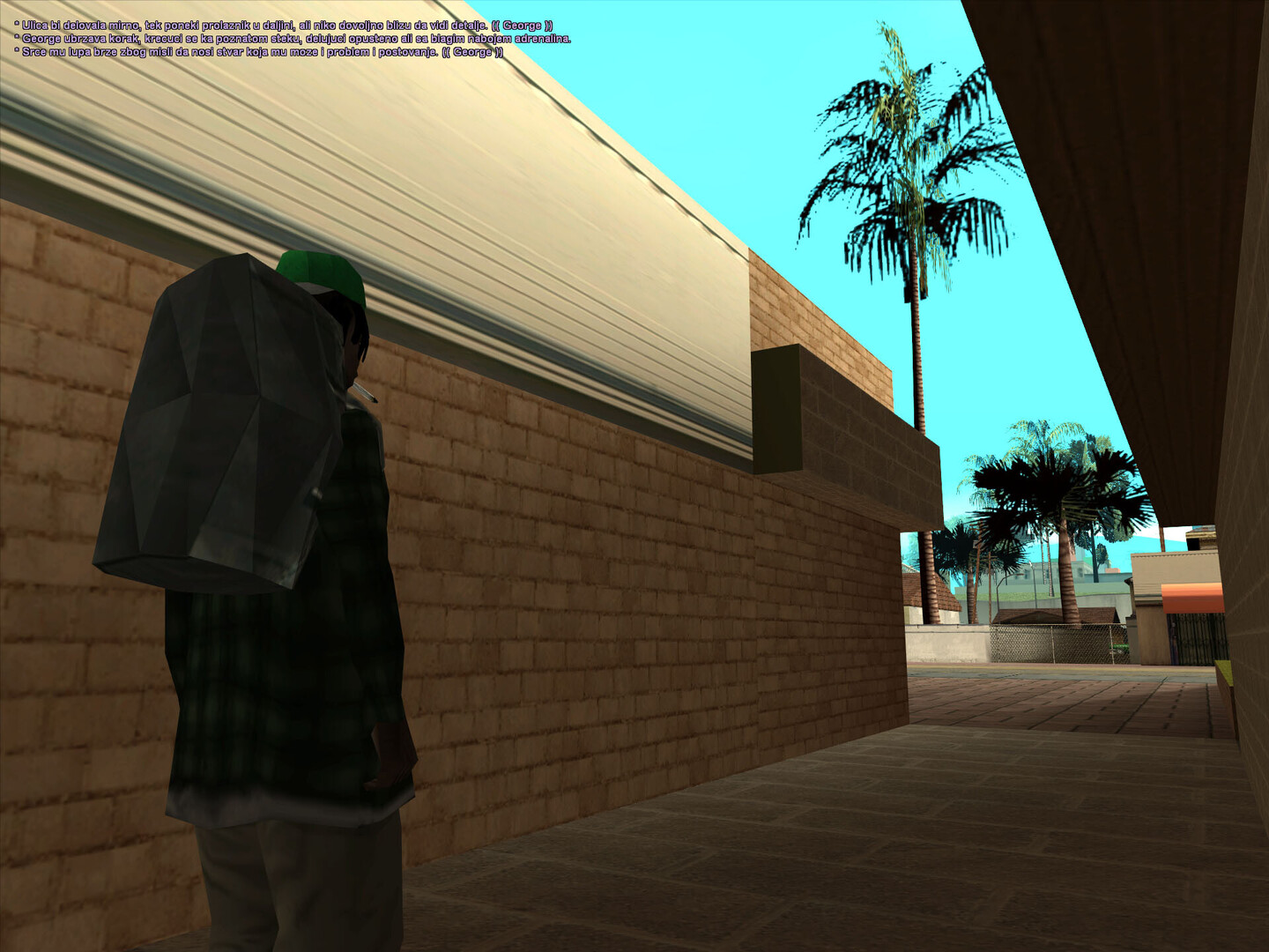 utro u Grove ulicama ima svoj poseban miris . Ozasao sam iz kuce dok je sunce jos bilo nisko , a vazduh svez . Hodao sam polako trotoarom , osecajuci skripu patika po prasnjavom betonu . Zastao sam kod bandere na cosku i pogledao niz prznu ulicu . Negde u daljini cuo se lavez psa ,a uz jedne kuce dopirao je miris kafe . Uzeo sam cigaretu , zppalio je i pustio dim da se polako raspline . Dok sam posmatrao igaliste na kraju ulice , razmisljo sam kako su ovi prvi dani prosli brzo ... i kako tek treba da vidim sta Grove zaista krije .