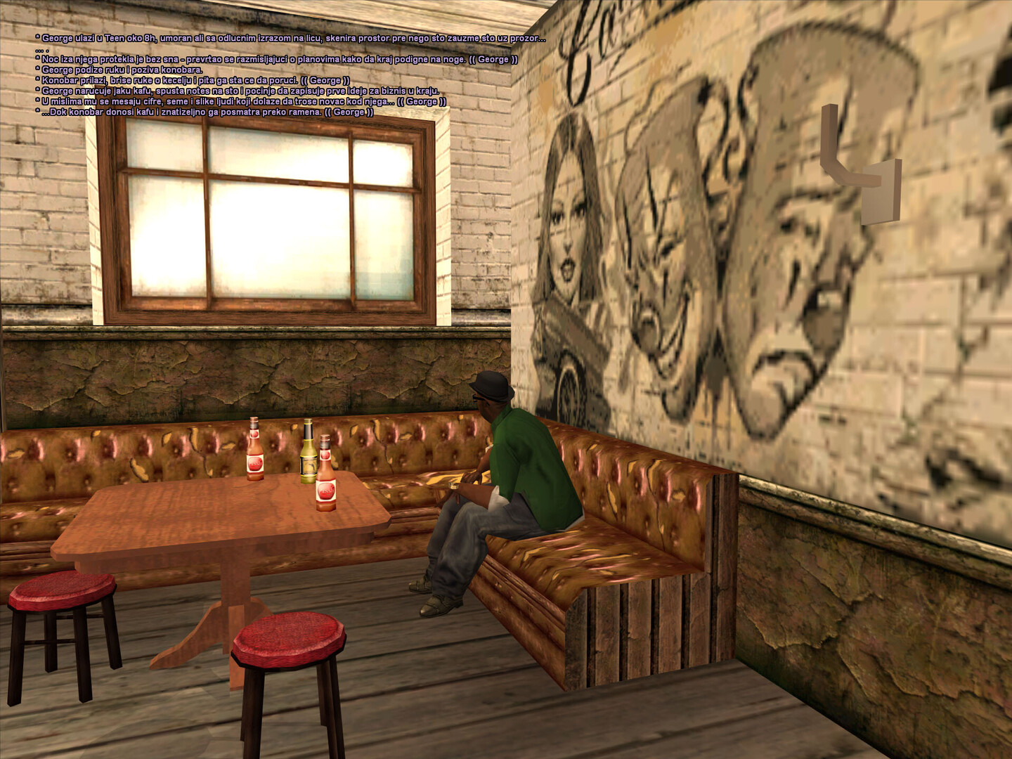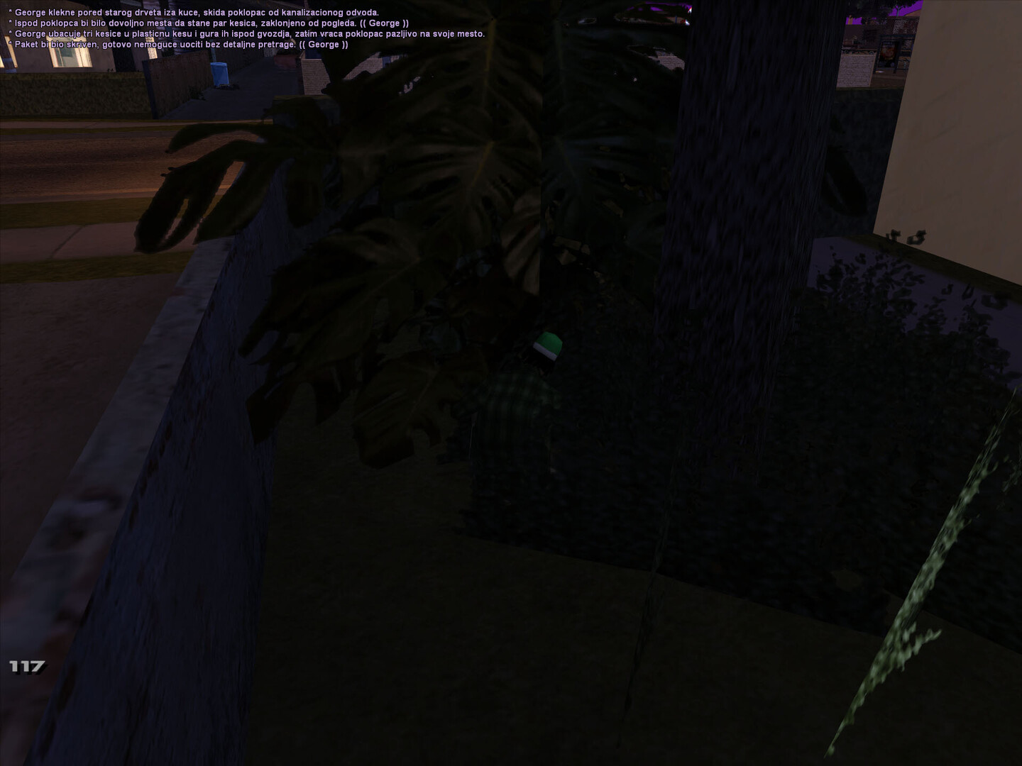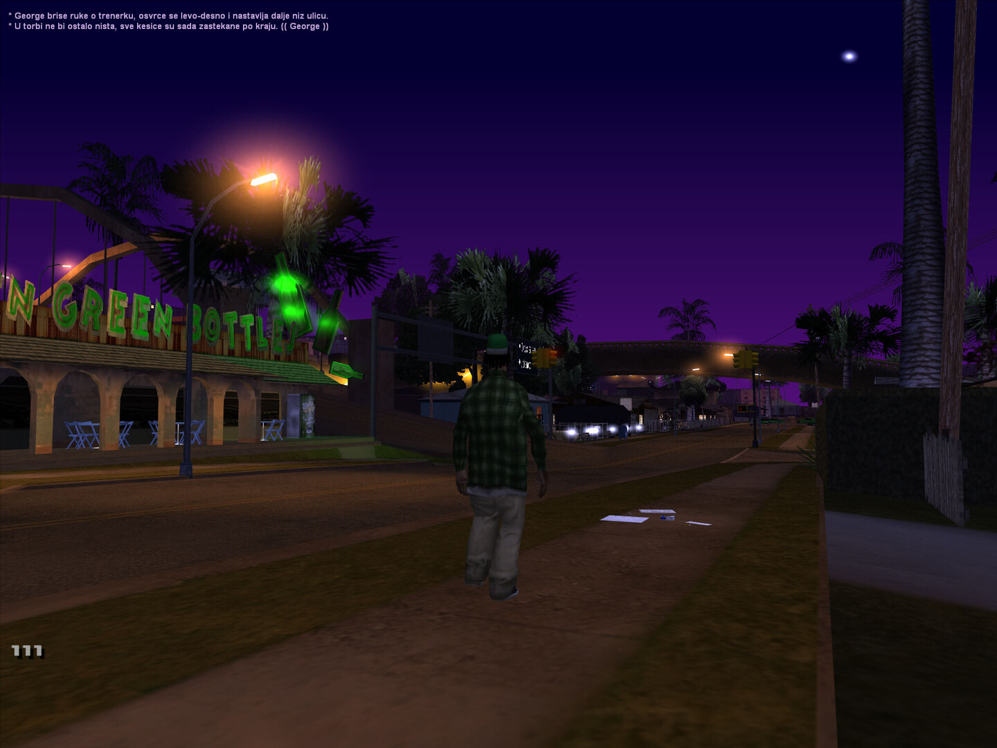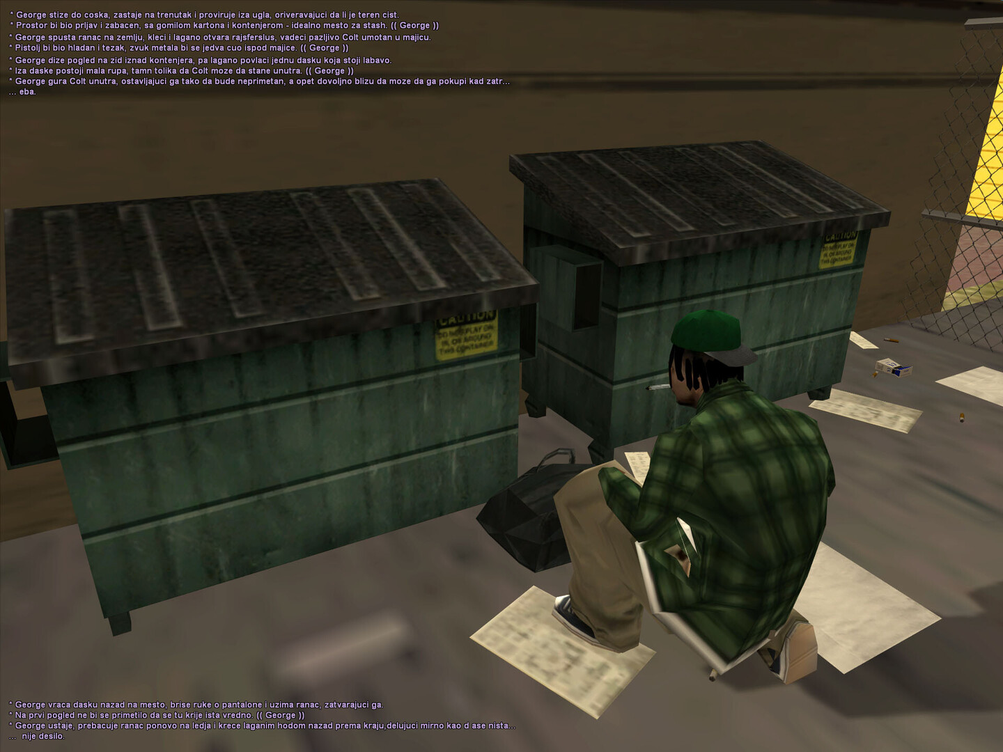 utro u Grove ulicama ima svoj poseban miris . Ozasao sam iz kuce dok je sunce jos bilo nisko , a vazduh svez . Hodao sam polako trotoarom , osecajuci skripu patika po prasnjavom betonu . Zastao sam kod bandere na cosku i pogledao niz prznu ulicu . Negde u daljini cuo se lavez psa ,a uz jedne kuce dopirao je miris kafe . Uzeo sam cigaretu , zppalio je i pustio dim da se polako raspline . Dok sam posmatrao igaliste na kraju ulice , razmisljo sam kako su ovi prvi dani prosli brzo ... i kako tek treba da vidim sta Grove zaista krije .